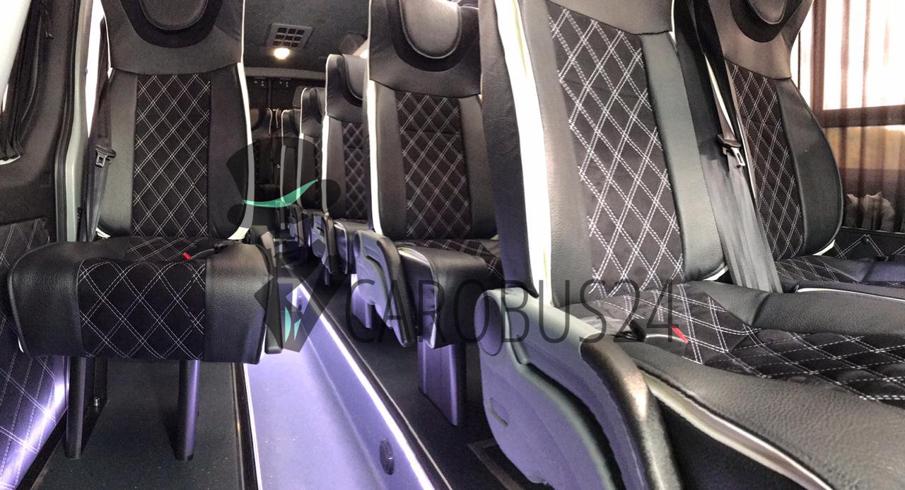 • авто премиум-класса, рассчитанное на 11 пассажирских мест, – модернизированный транспорт с более компактным размещением сидений в два одноместных ряда;